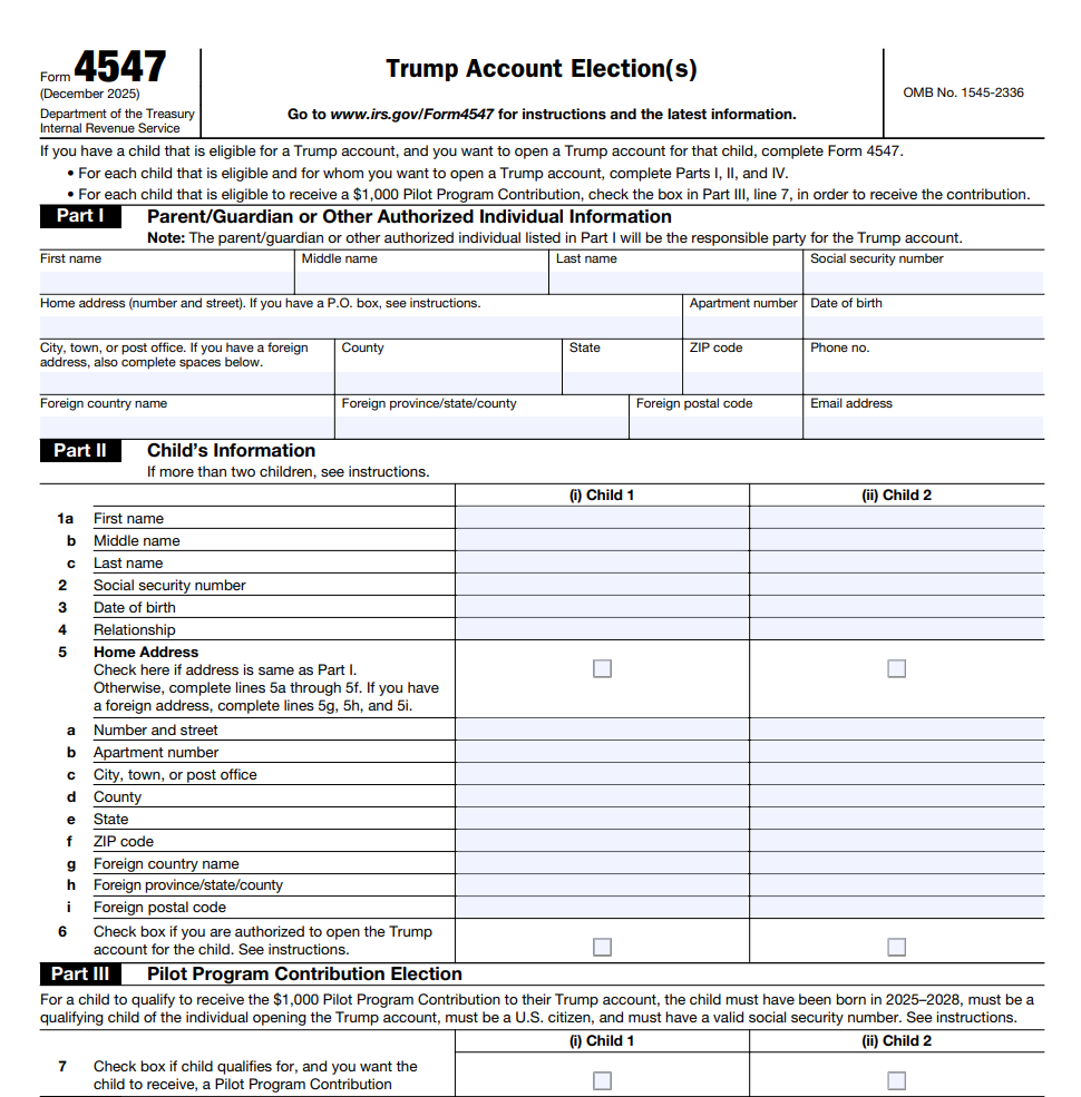 Form 4547 (Trump Account Election) is used to establish a Trump Account and elect the $1,000 pilot contribution. You must file this form to receive the government contribution.